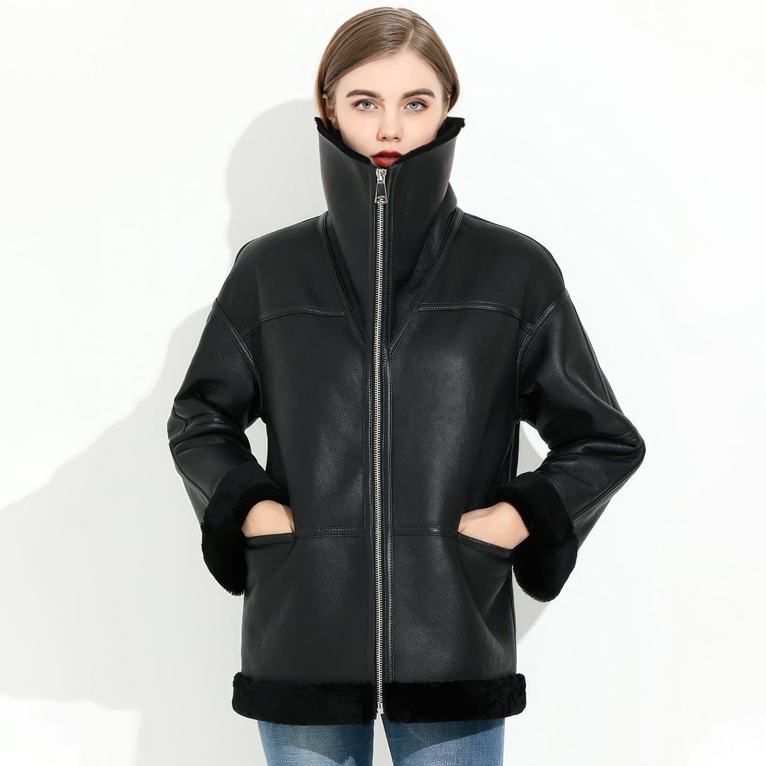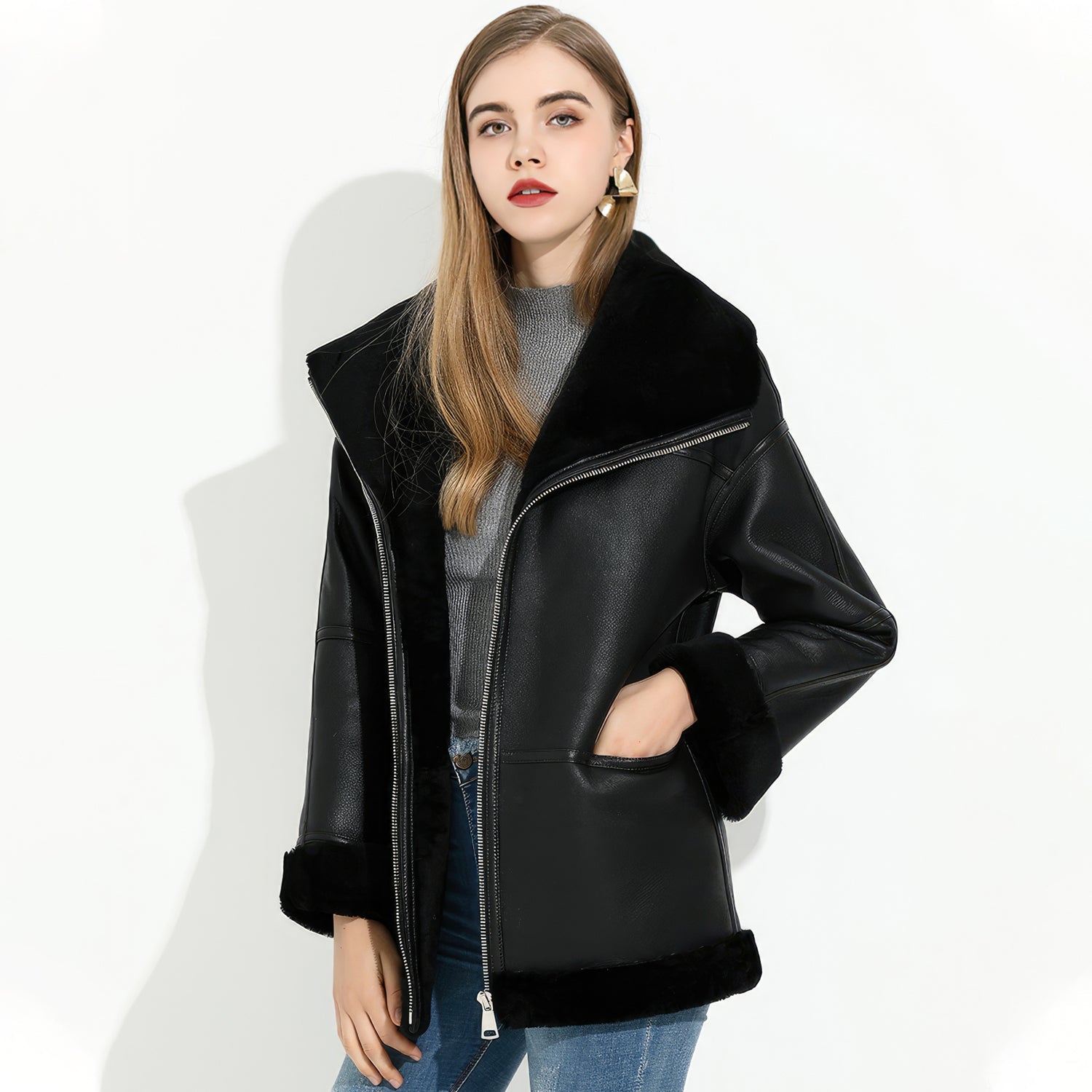 Women’s Black Genuine Sheepskin Sherpa Shearling Faux Fur Lined Winter Warm Eco-Fur Fashionable Aviator Pilot Leather Jacket