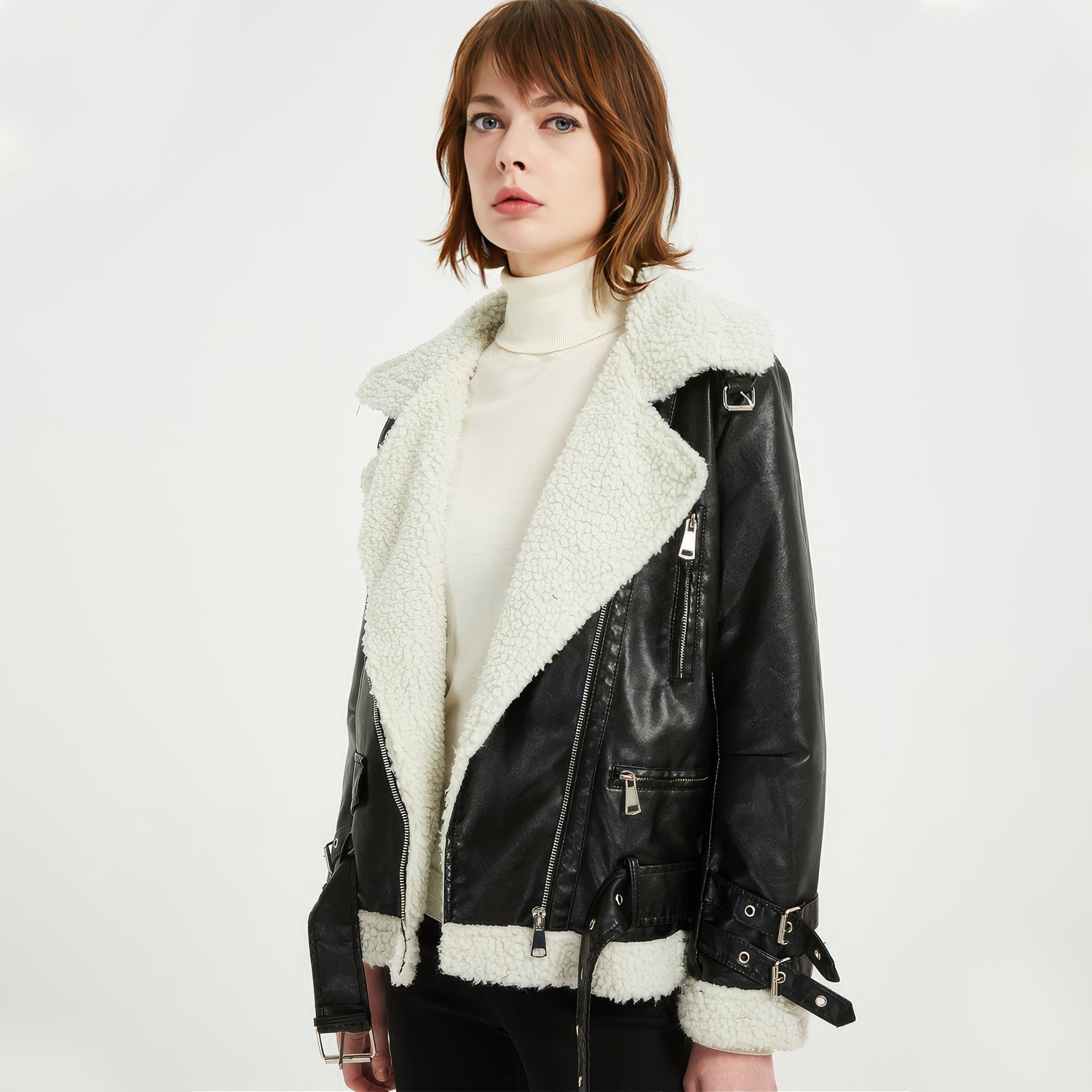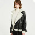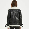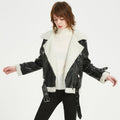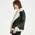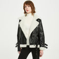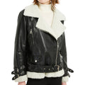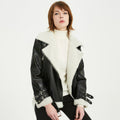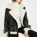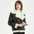 Women’s Black Genuine Sheepskin Sherpa Shearling Faux Fur Lined Winter Warm Korean style Asymmetric Zip-Up Leather Jacket