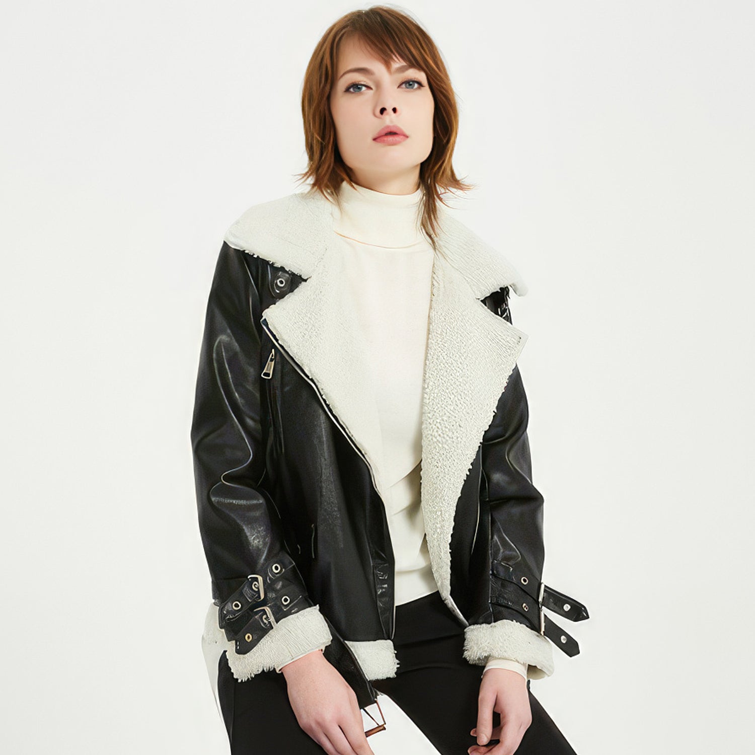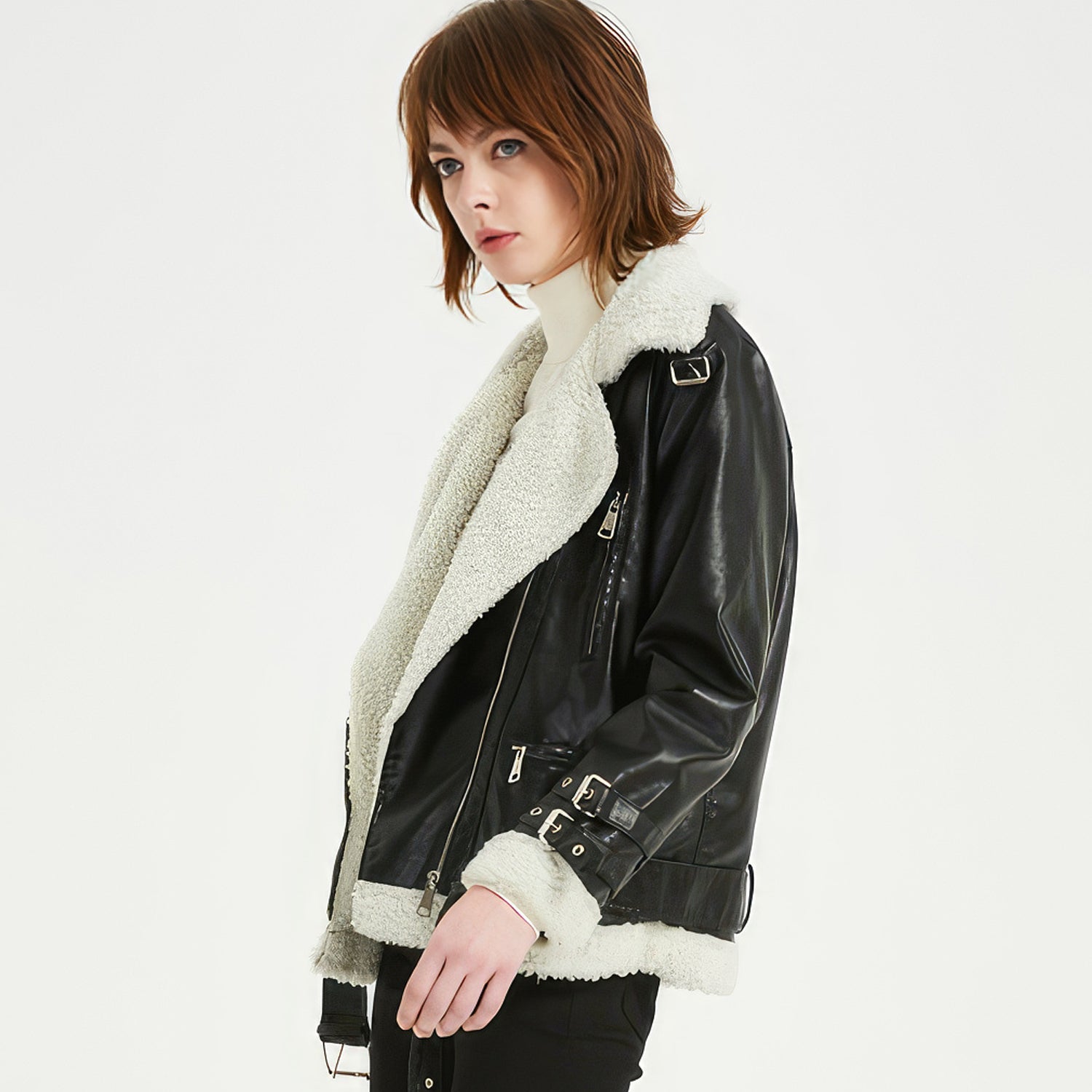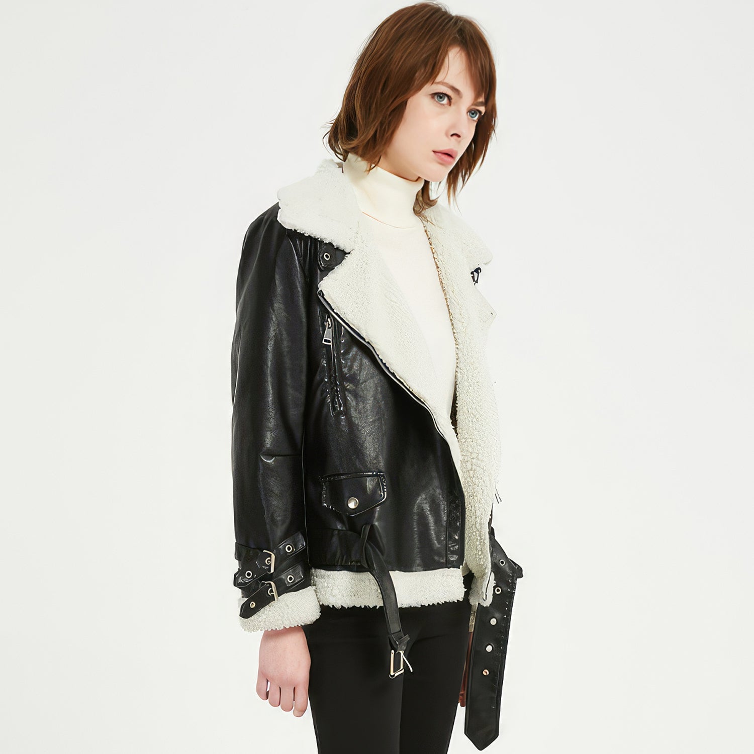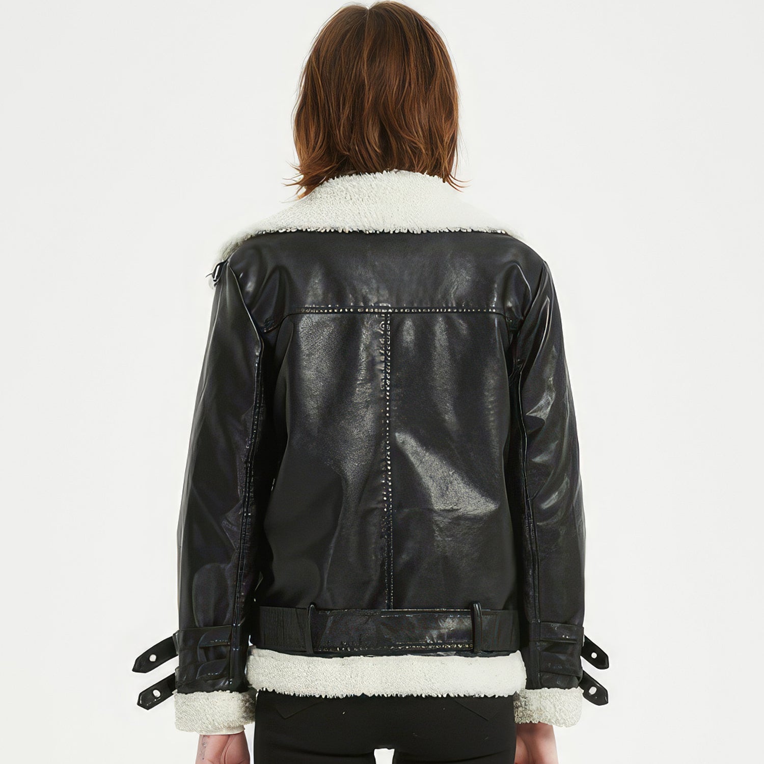 Embrace the winter season with our Women’s Black Genuine Sheepskin Leather Jacket. This luxury item, made from genuine sheepskin leather, provides unrivaled warmth thanks to its Sherpa shearling faux fur lining. The asymmetric YKK zip closure adds a fashionable touch, while the waist belt ensures a perfect fit. Equipped with YKK zip pockets, this jacket seamlessly combines style, comfort, and practicality. Its Korean style design makes it an ideal addition to your winter wardrobe, effortlessly complementing any outfit.