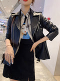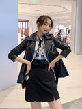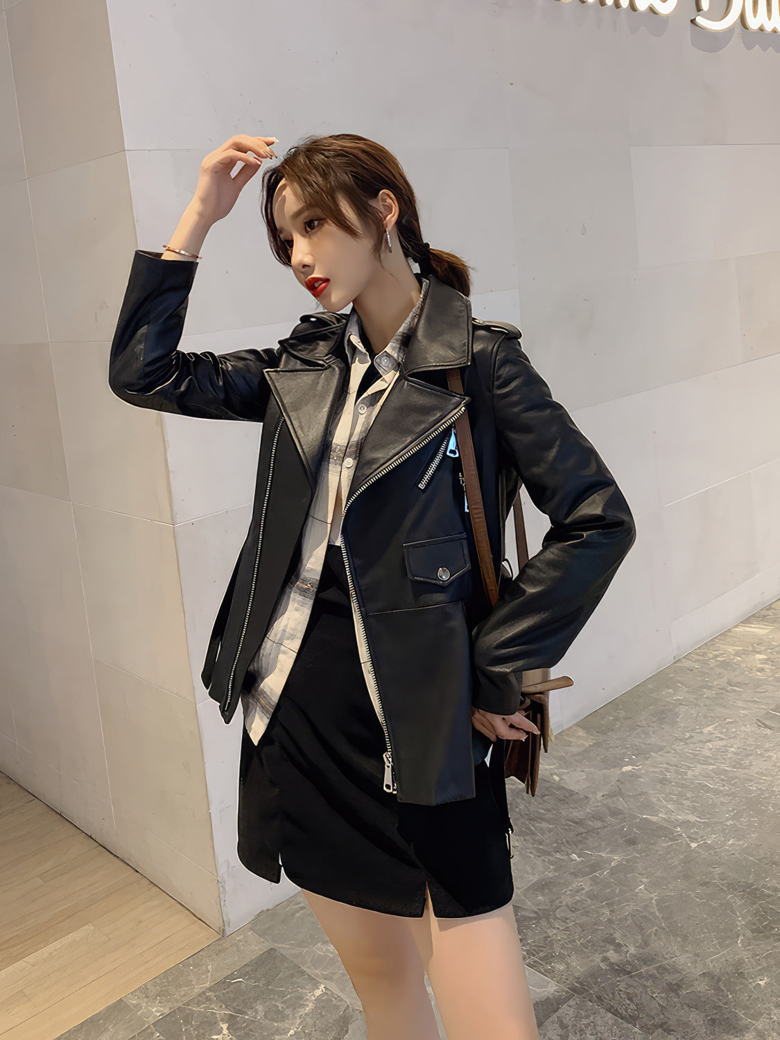 Women’s Black Genuine Sheepskin Suit Collar Motorcycle Pleated Korean Style Asymmetric Crossover Winter Leather Jacket