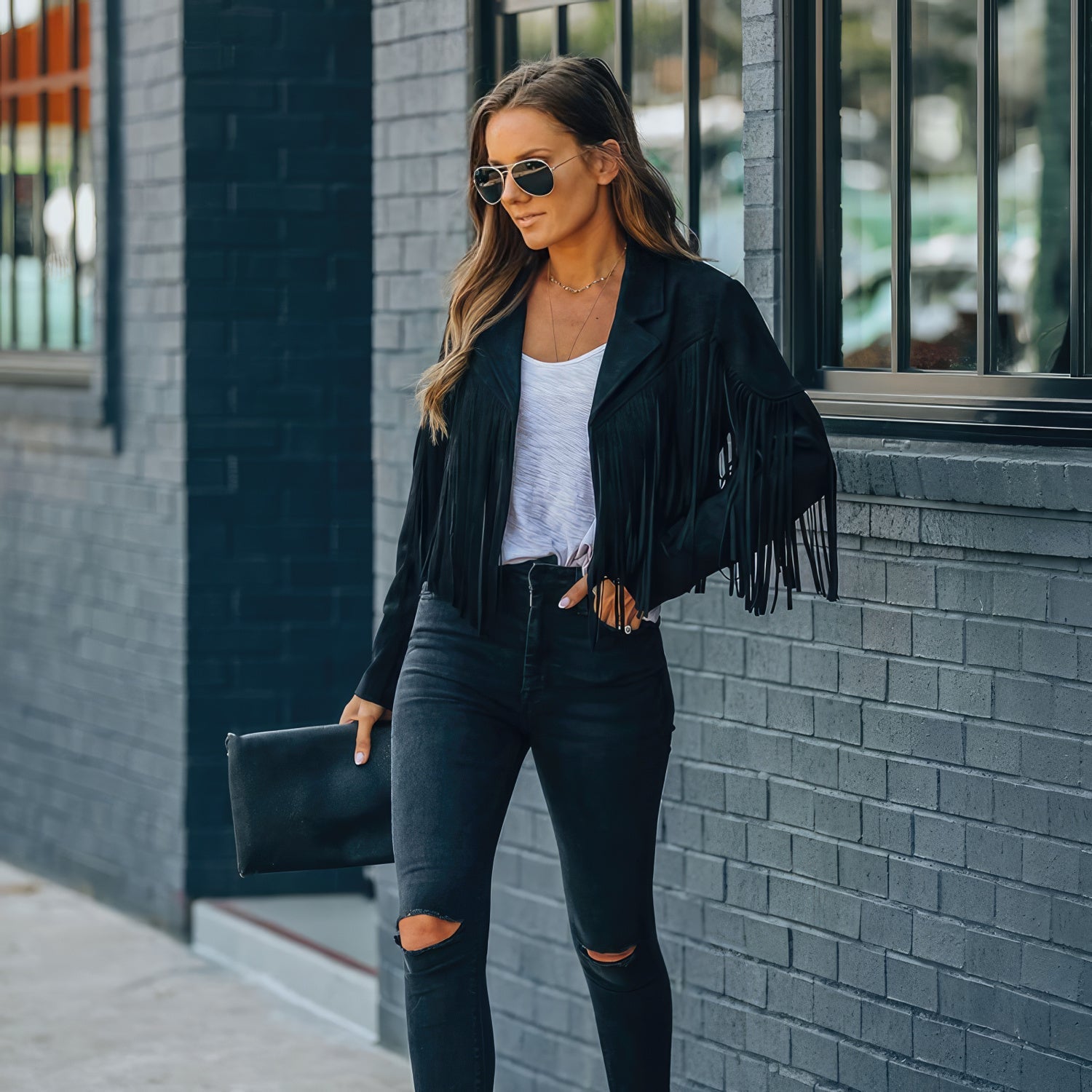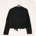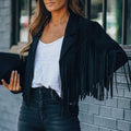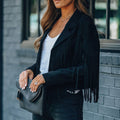 Women’s Black Genuine Suede Tassel Lapel Long Sleeve Motor Biker Native American Vintage Cropped Leather Jacket