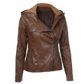 Women’s Brown Biker Genuine Sheepskin Hooded Scooter Sporty Crossover Vintage Slim Fit Asymmetric Leather Jacket
