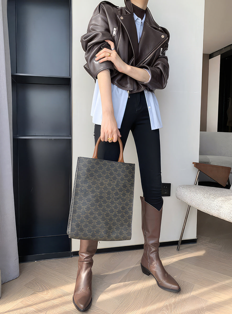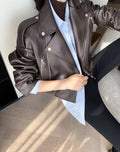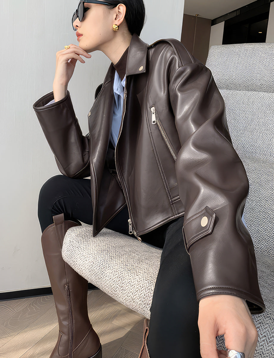 Women’s Brown Biker Genuine Sheepskin Lapel Collar Classic Korean Style Fashion Outfit Short Oversized Real Leather Jacket