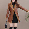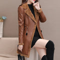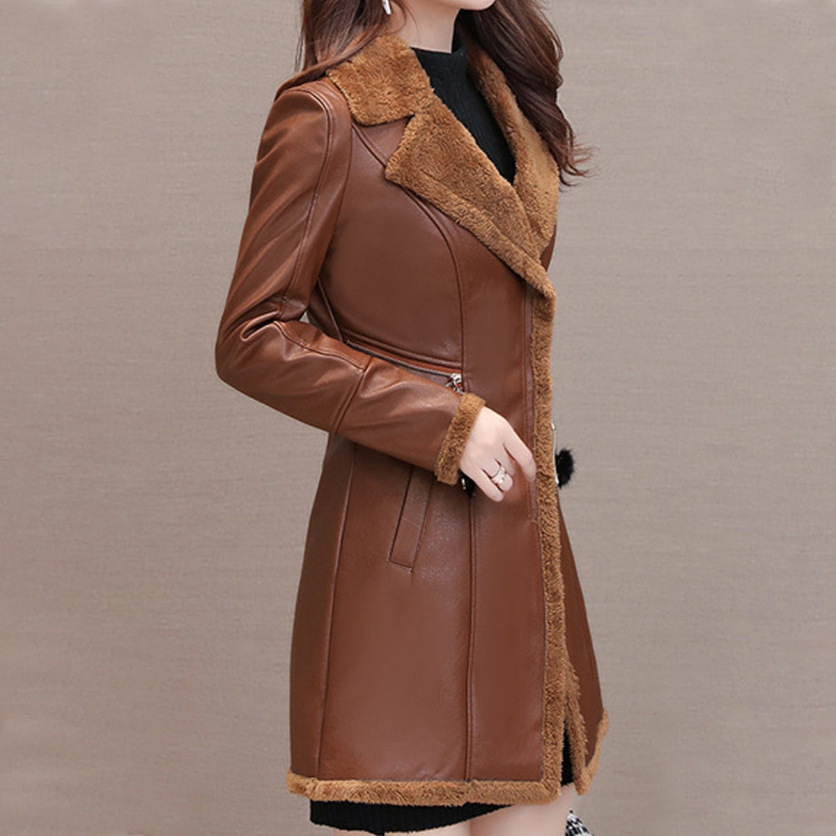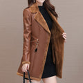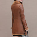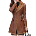Women’s Brown Genuine Sheepskin Lapel Collar Sherpa Shearling Faux Fur Lined Thick Warm Casual Classic Single Breasted Trench Style Leather Coat Jacket