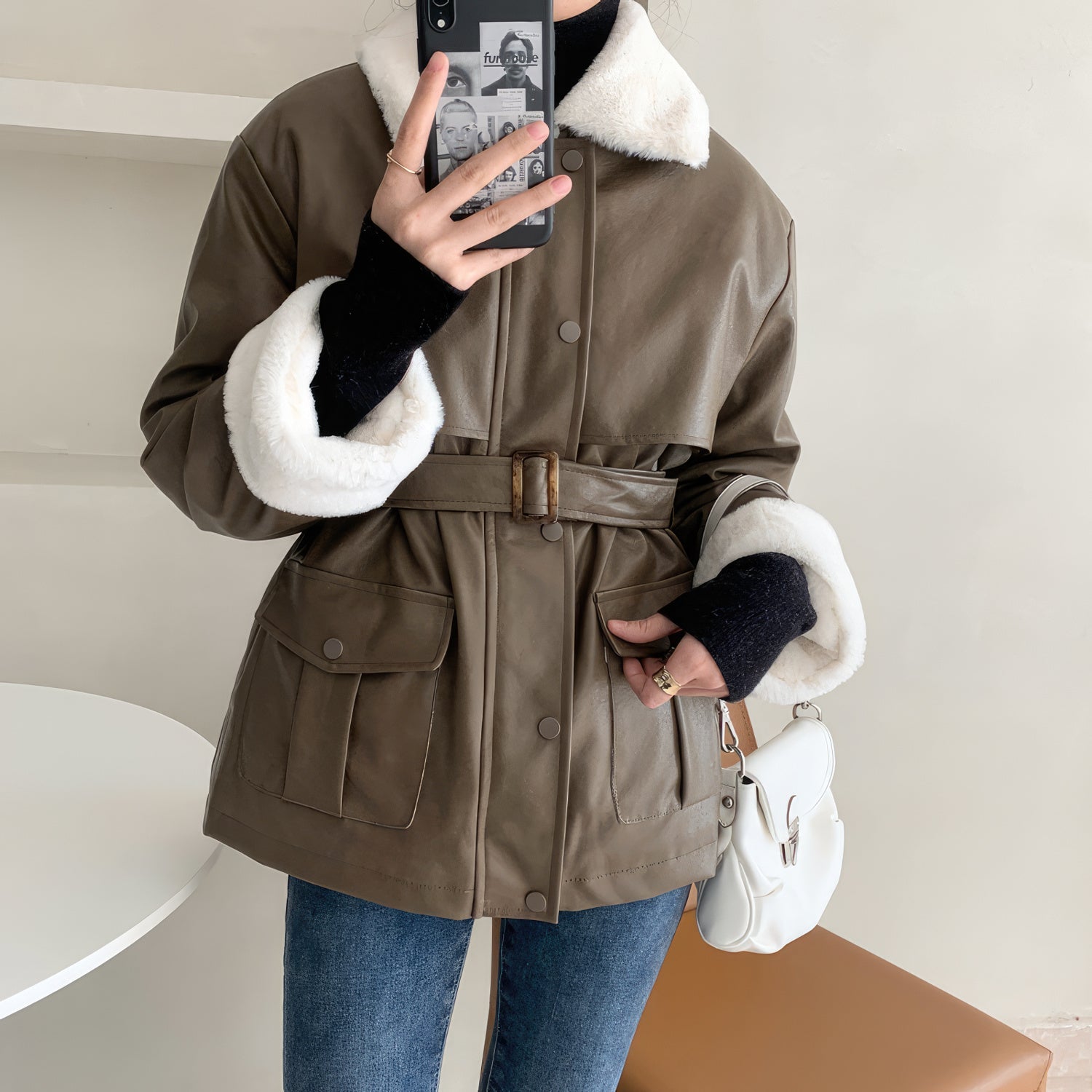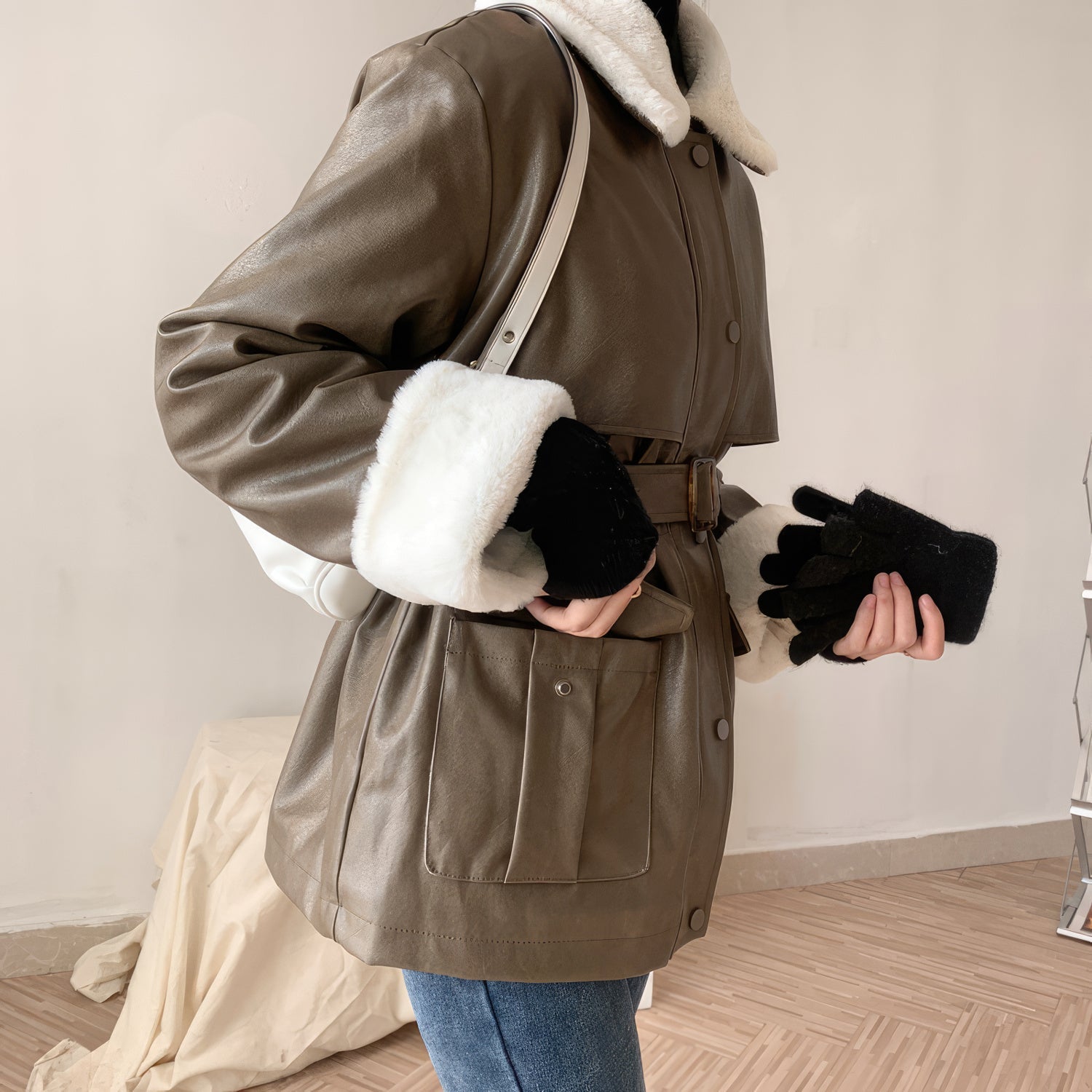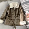 Women’s Brown Genuine Sheepskin Sherpa Shearling Faux Fur Lined Belted Winter Warm Casual Fashion Loose Leather Jacket