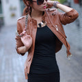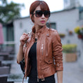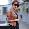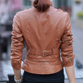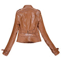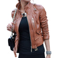 Women’s Brown Genuine Sheepskin Stand Collar Casual Motorcycle Racer Zip-Up Slim Fit Retro Biker Classic Smooth Leather Jacket