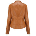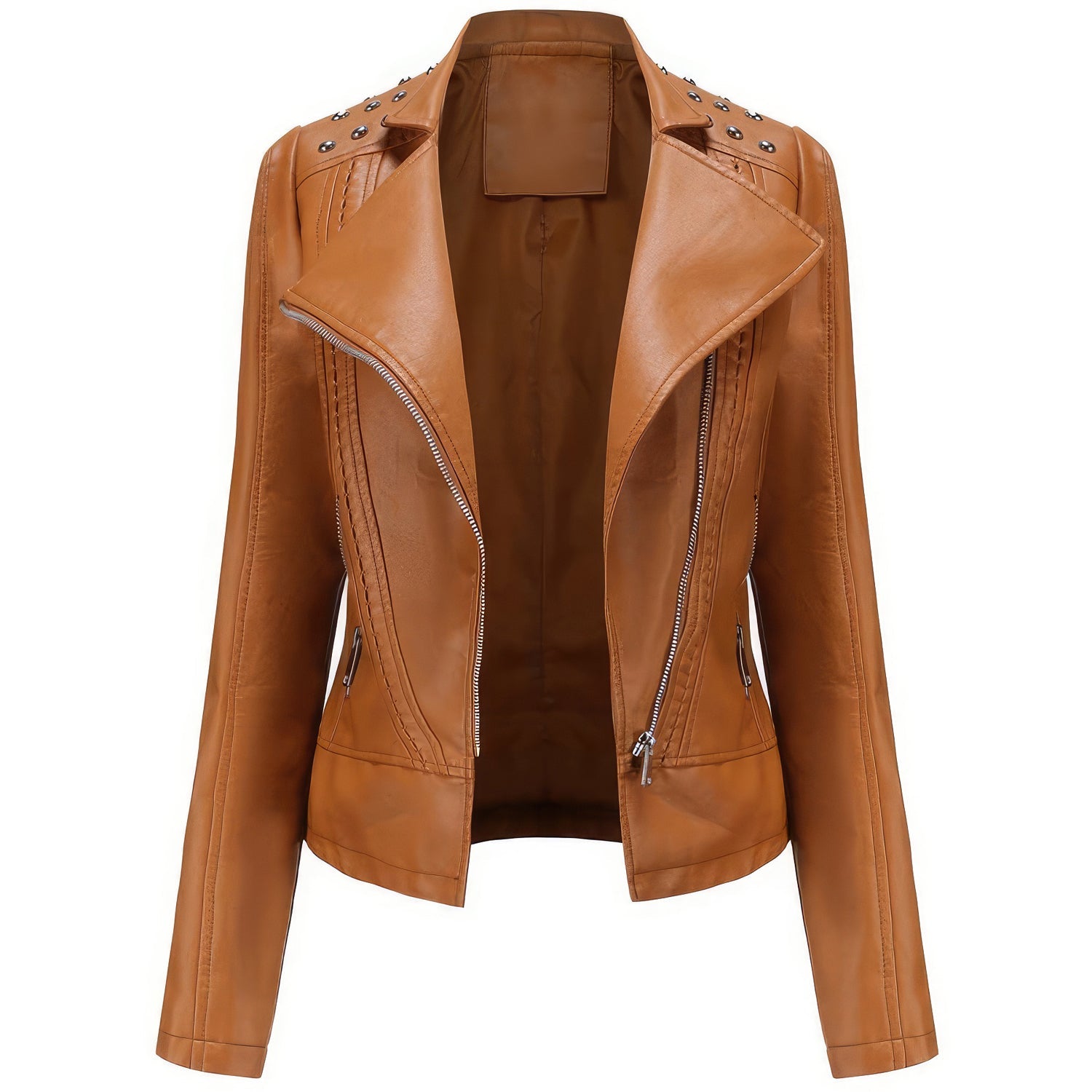 Women’s Camel Brown Biker Genuine Sheepskin Studded Shoulders Fashionable Motorcycle Rivet Crossover Asymmetric Slim Fit Leather Jacket