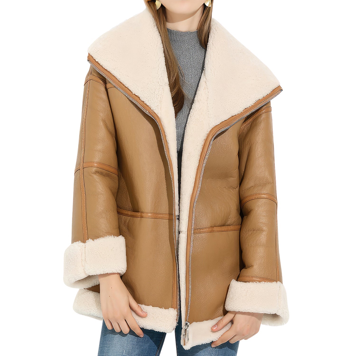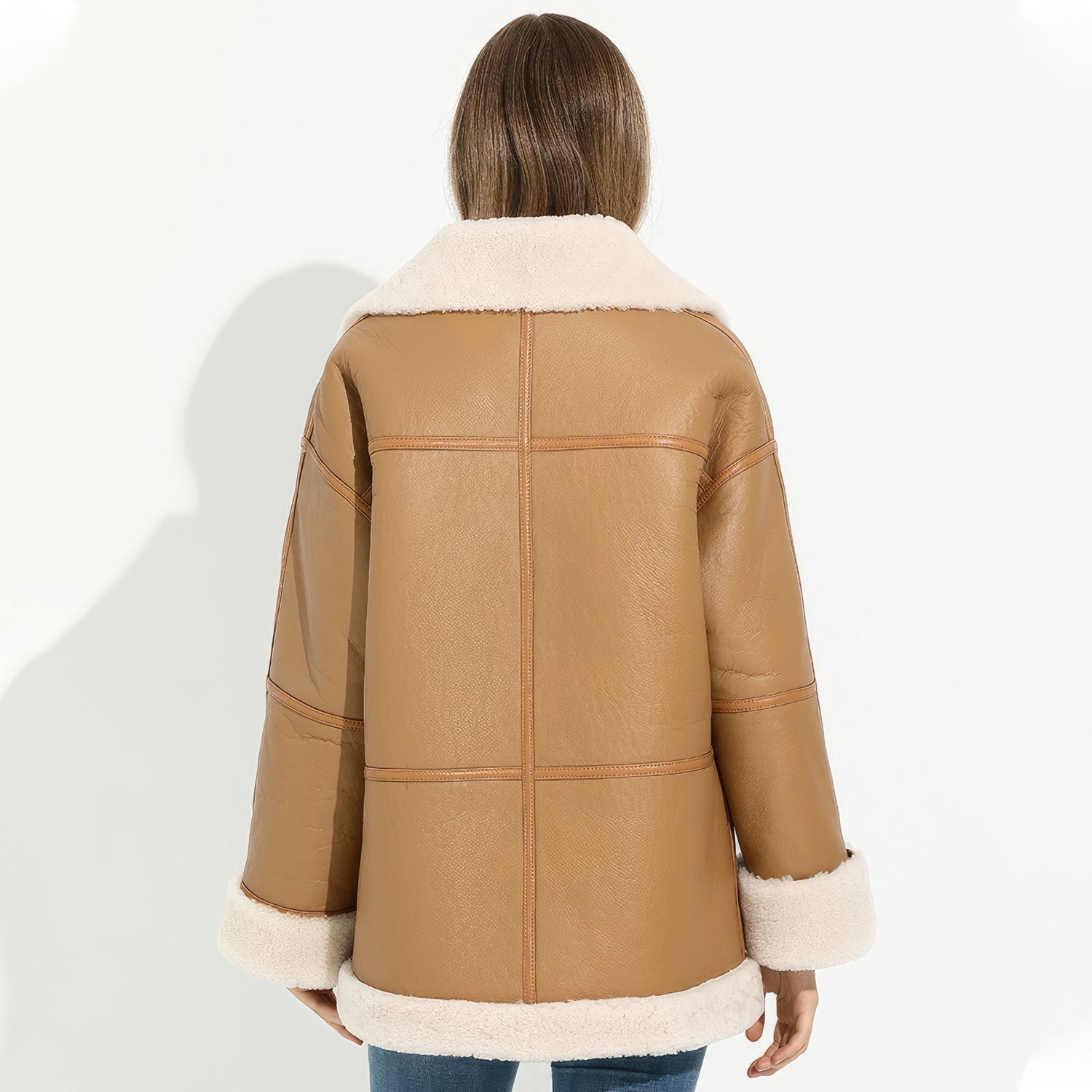 Women’s Camel Brown Genuine Sheepskin Sherpa Shearling Faux Fur Lined Winter Warm Eco-Fur Fashionable Aviator Pilot Leather Jacket