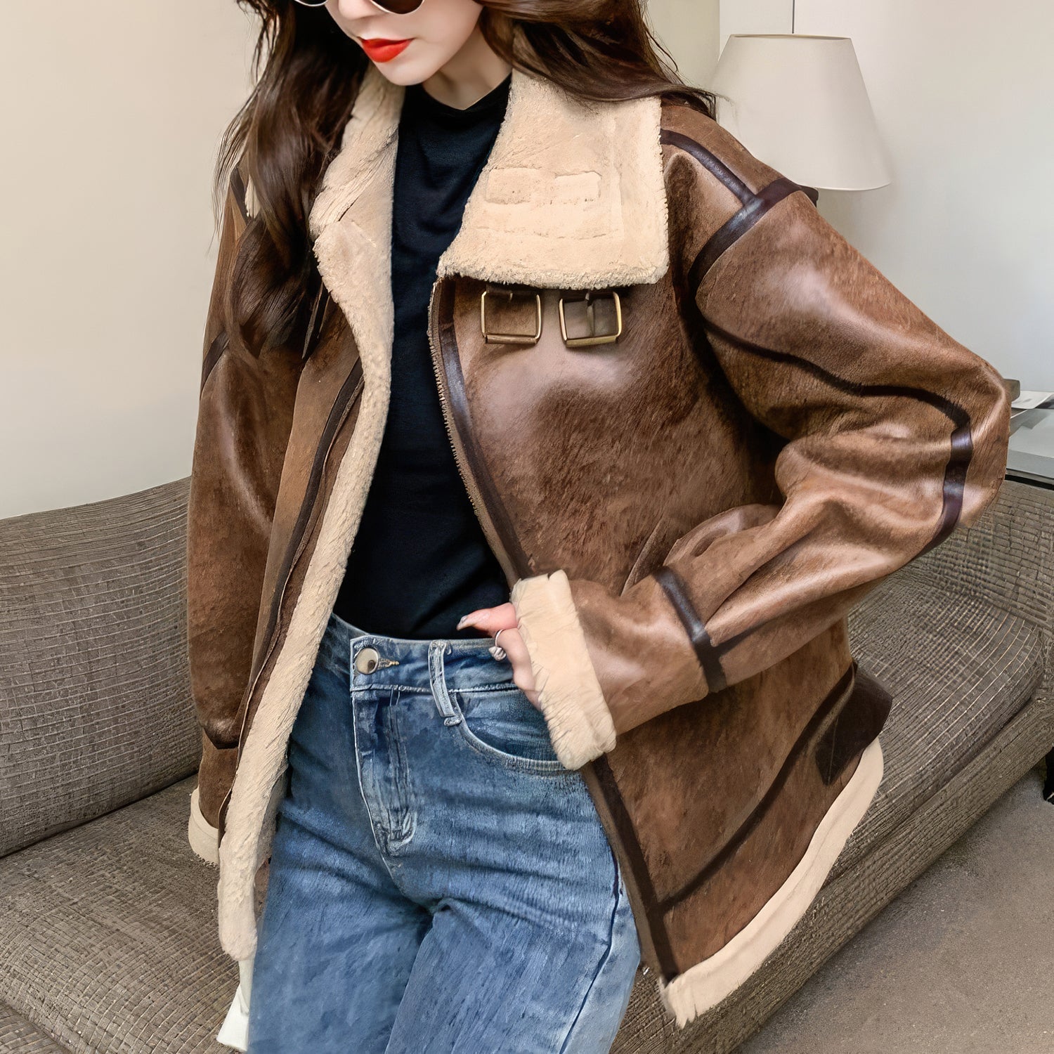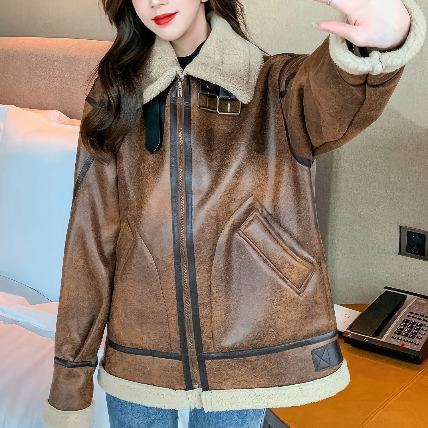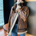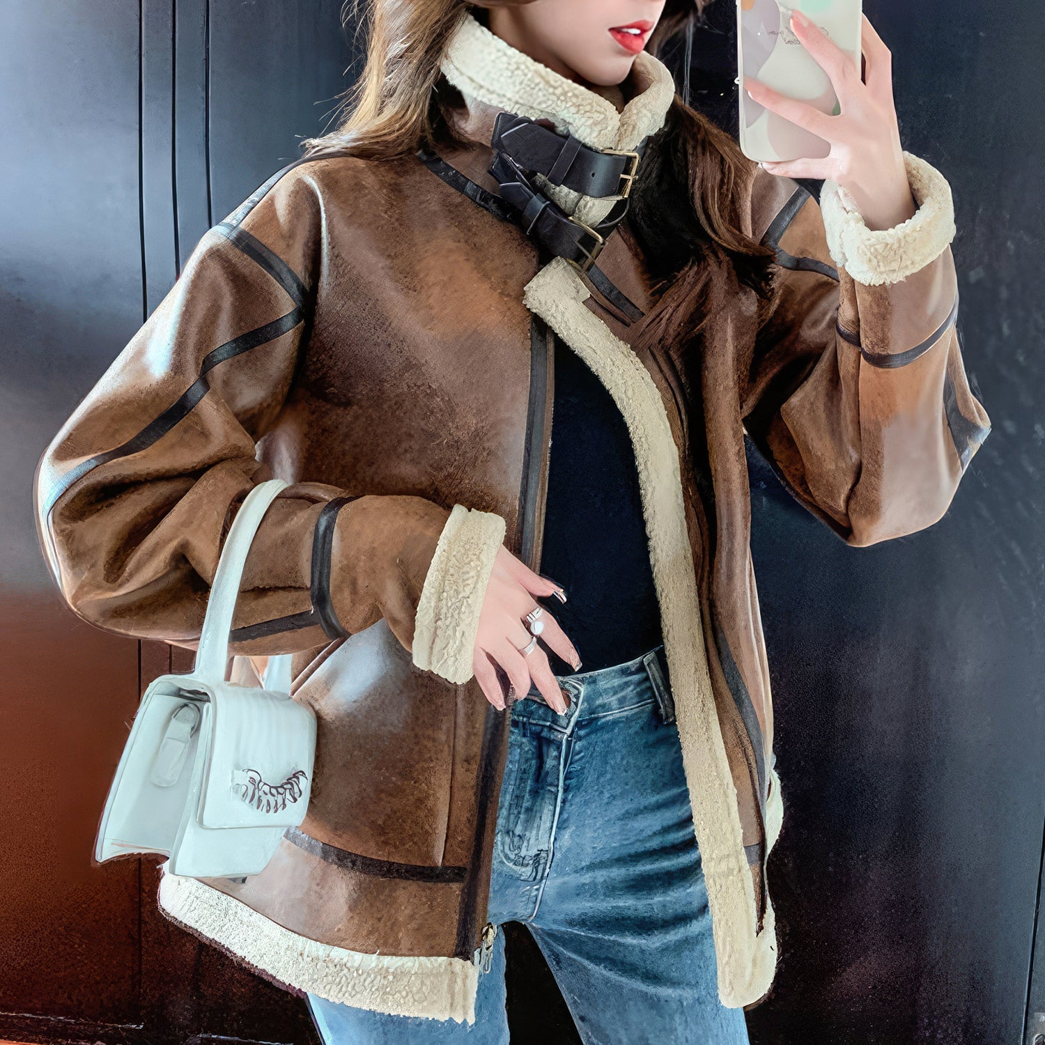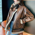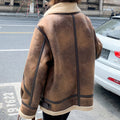 Women’s Distressed Brown Aviator Genuine Sheepskin Sherpa Shearling Faux Fur Lined Thick Winter Warm Streetwear Chic Flight Pilot Leather Jacket