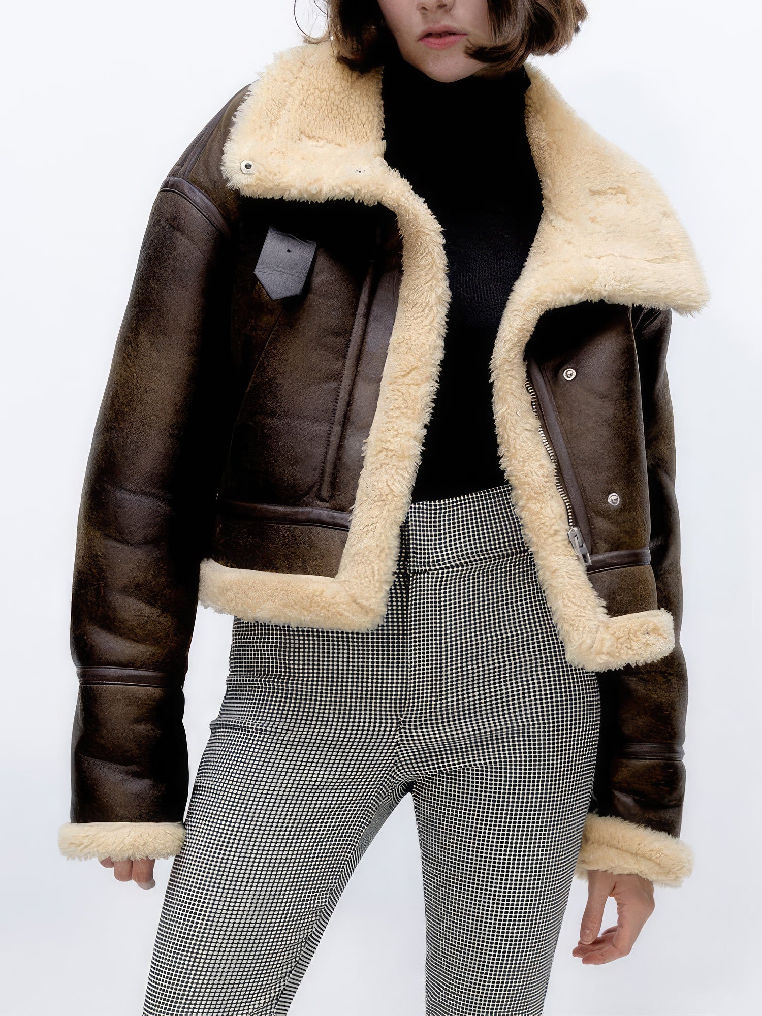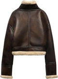 Stay warm and stylish with our Women’s Distressed Brown Genuine Lambskin Sherpa Shearling Faux Fur Lined Moto Biker Fashion Winter Thick Bomber Leather Jacket. Crafted from 100% genuine lambskin leather, this jacket delivers durability and a luxurious feel. It features a comforting polo neck and handy slash pockets, ensuring both warmth and practicality during the colder months. The cozy Sherpa shearling faux fur lining guarantees additional warmth, making this jacket your go-to for winter. The secure YKK front zip closure offers a snug fit and contributes to the jacket's overall durability. Embodying Moto biker fashion, this bomber leather jacket is the perfect piece to make a bold style statement while enjoying the winter season in comfort.