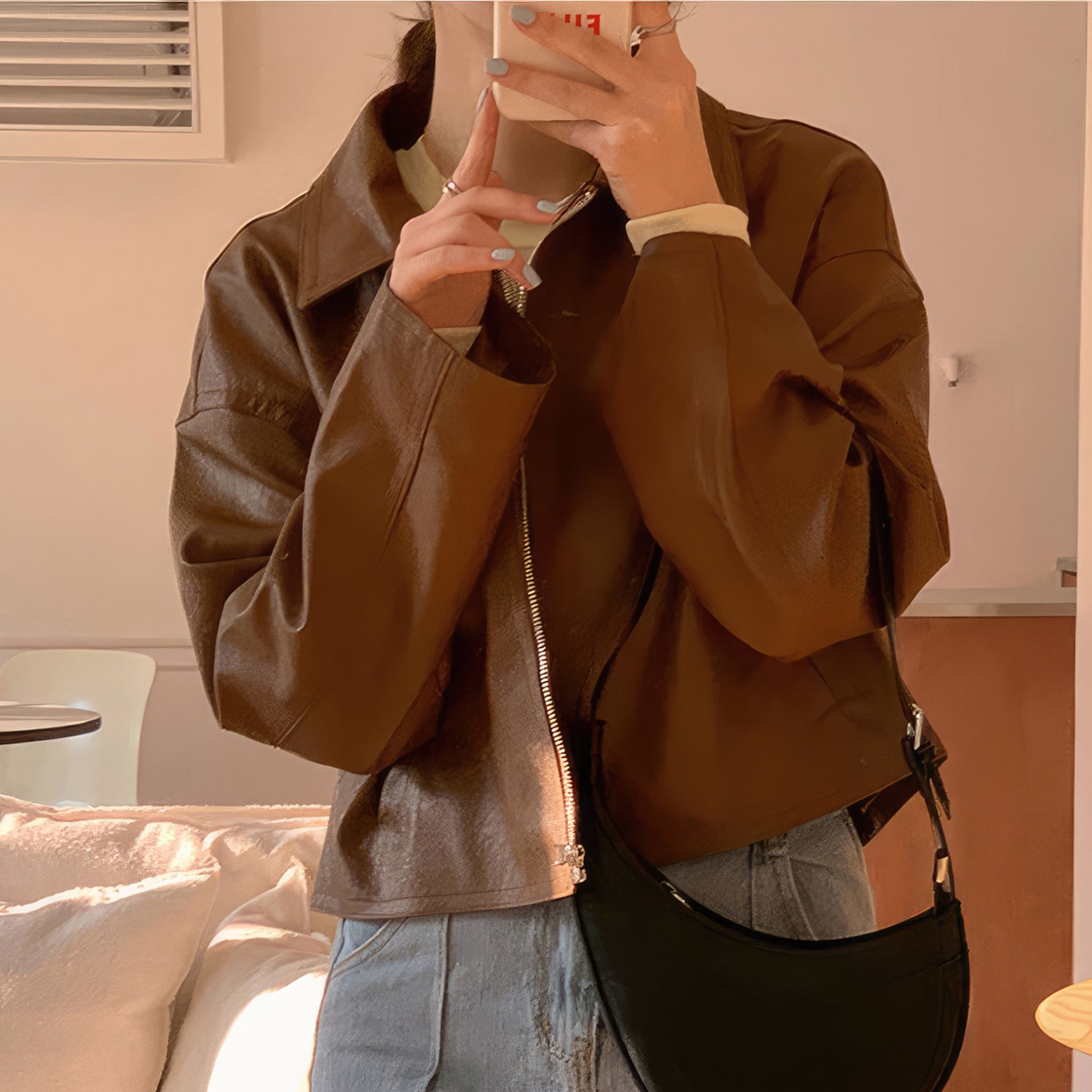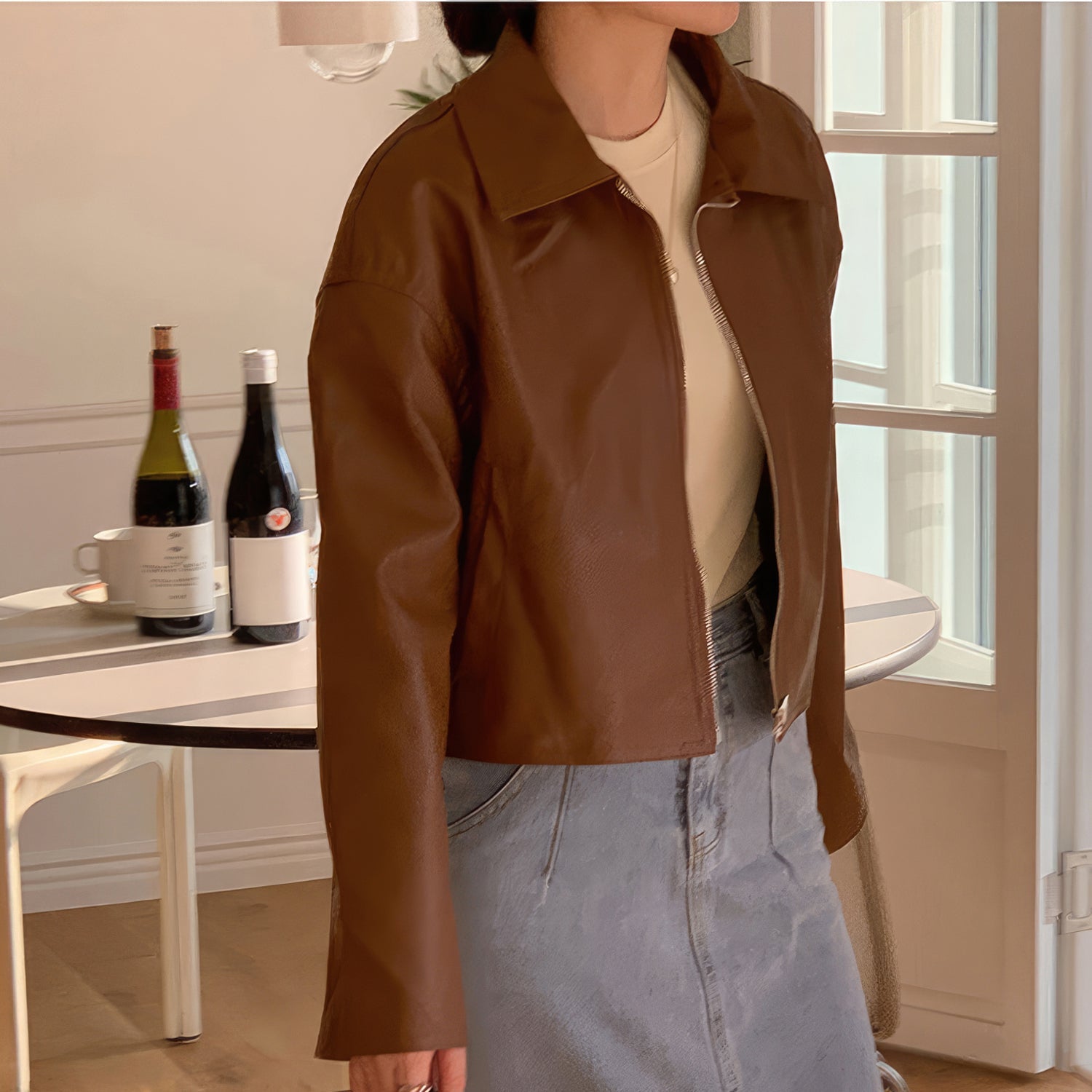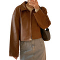 Women’s Genuine Sheepskin Shirt Collar Casual Korean Retro Fashion Chic Retro Zip-Up Smooth Loose Lightweight Leather Jacket