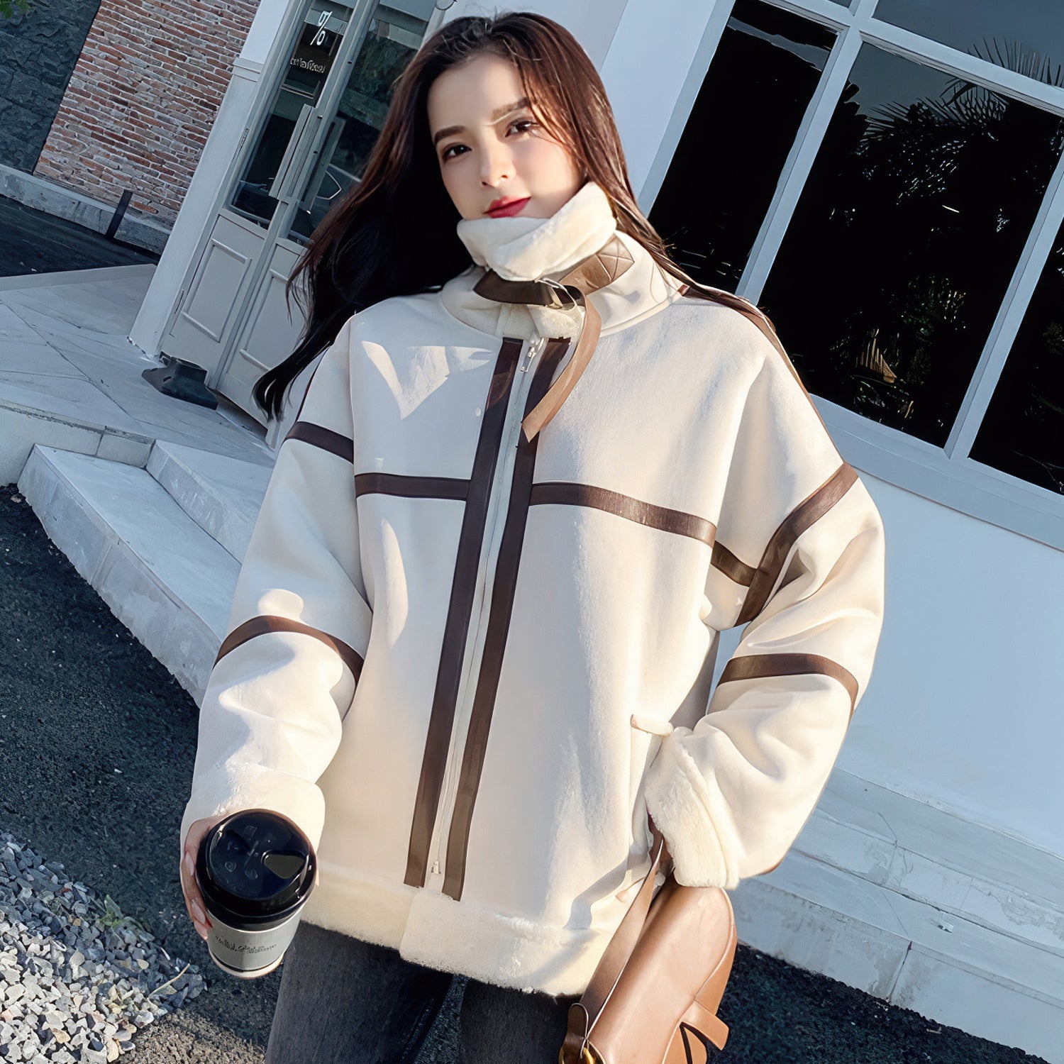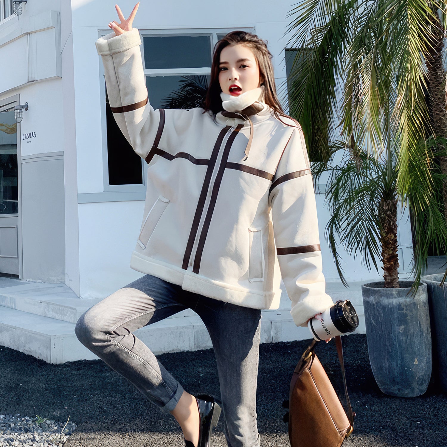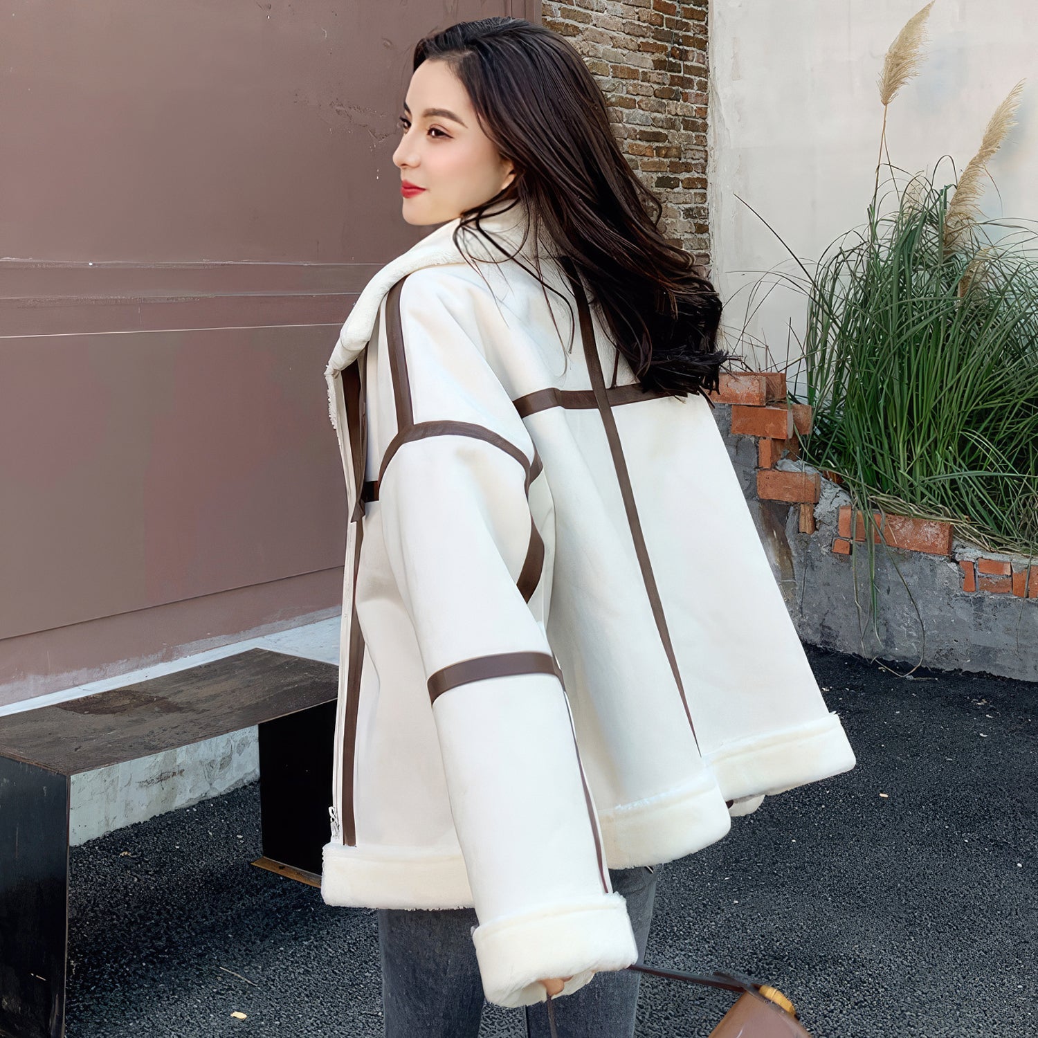 Women’s Off-White Genuine Suede Sherpa Shearling Faux Fur Lined Brown Strips Loose Oversized Motorcycle Racer Leather Jacket