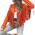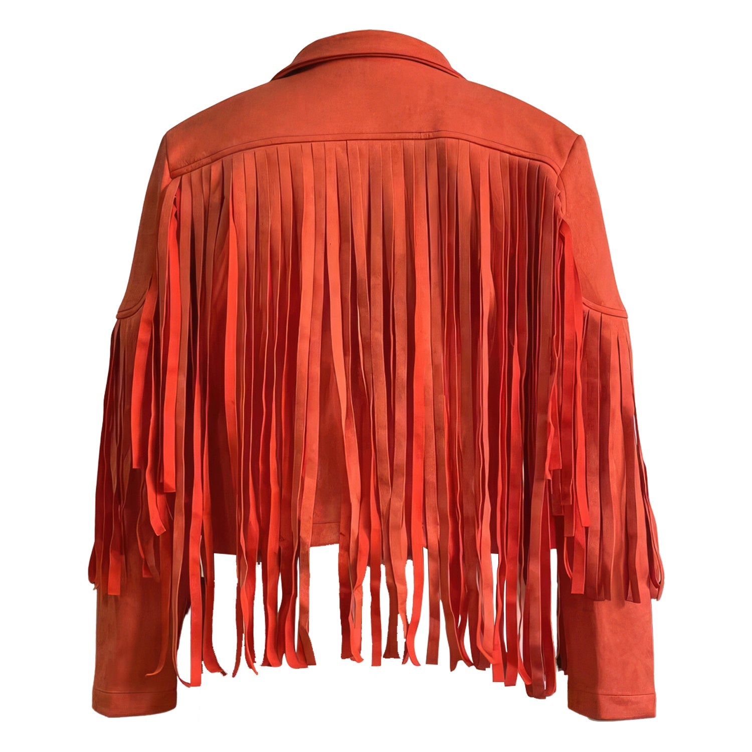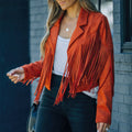 Women’s Orange Genuine Suede Tassel Lapel Long Sleeve Motor Biker Native American Vintage Cropped Leather Jacket