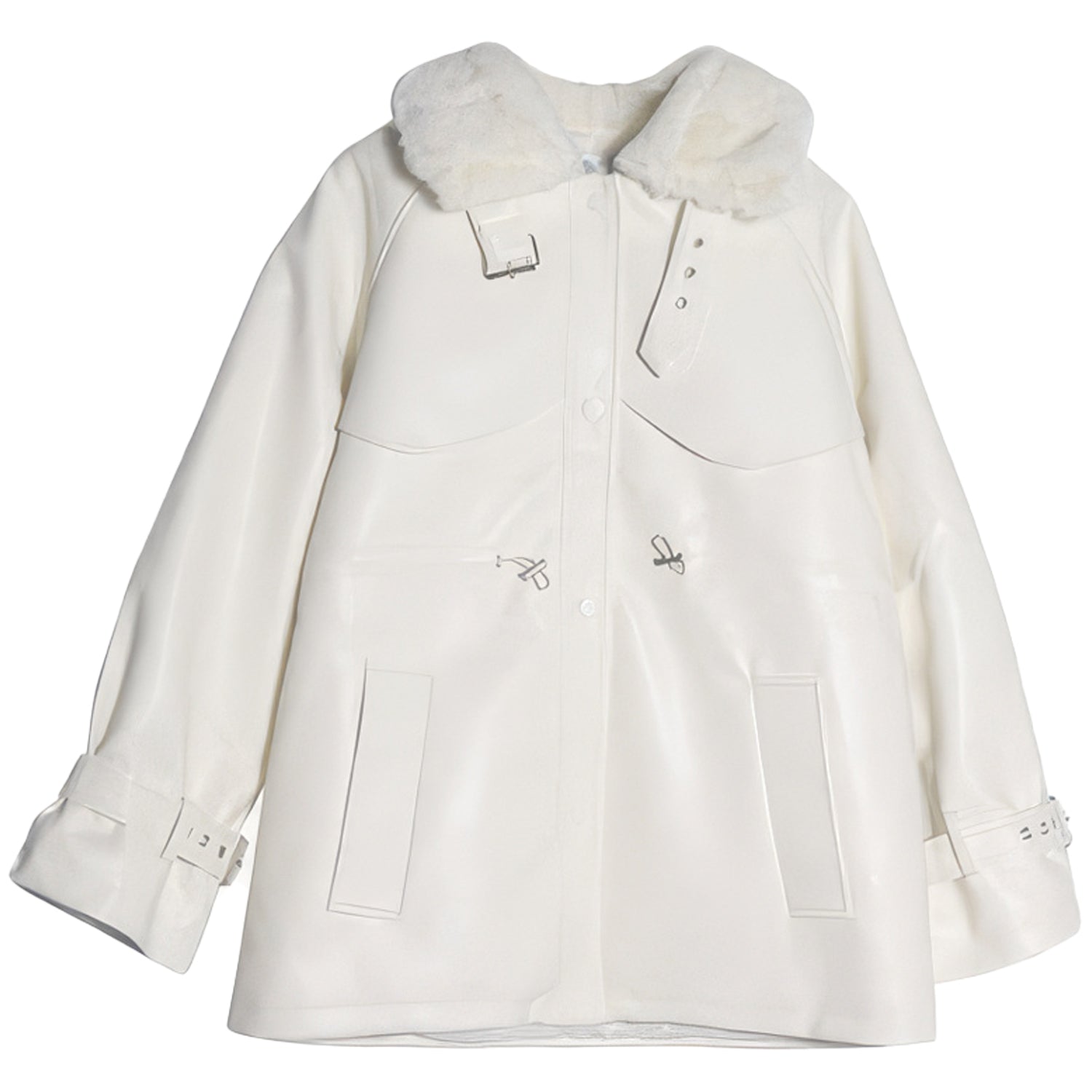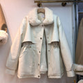 Women’s White Genuine Sheepskin Sherpa Shearling Faux Fur Lined Casual Fashion Thick Oversized Waist Drawstring Leather Jacket